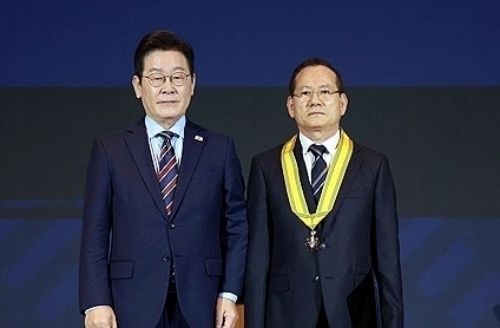À̳¯ ±â³ä½Ä¿¡ Âü¼®ÇÑ ÀÌÀç¸í ´ëÅë·ÉÀº À¯°ø Àç¿Üµ¿Æ÷µé¿¡°Ô ±¹¹ÎÈÆÀå°ú ±¹¹ÎÆ÷ÀåÀ» Á÷Á¢ ¼ö¿©Çß´Ù.